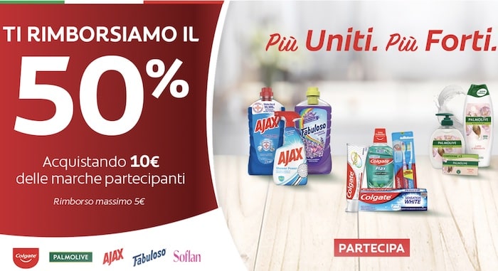 Con la nuova promo PIÙ UNITI PIÙ FORTI potrai acquistare nei punti vendita che espongono il materiale pubblicitario e che emettono Scontino Parlante e anche su Amazon.it, i prodotti dei marchi Soflan, Fabuloso, Colgate, Palmolive e Ajax e ricevere successivamente il tuo rimborso di massimo 5€